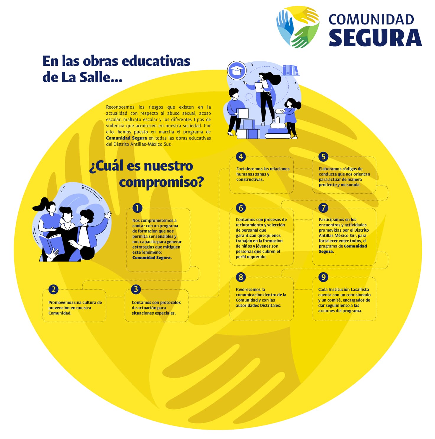 Comunidad Segura es un programa que arranca en el ciclo escolar 2018-2019 en los diferentes niveles educativos del Distrito Antillas-México Sur, con el objetivo de fortalecer una cultura de prevención y provención en torno a cualquier situación que ponga en riesgo el bienestar de la comunidad educativa.